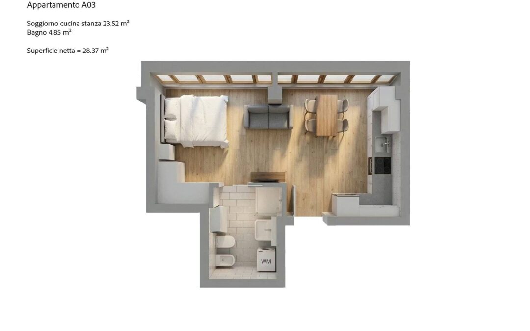 L’unità sarà realizzata come ambiente open space, con zona living e zona notte integrate nello stesso spazio, senza suddivisioni interne.